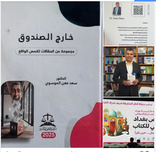 الكتاب الجديد للفريق سعد معن الموسوي الموسوم (خارج الصندوق) عبارة عن ” مجموعة مقالات تلامس الواقع ” حيث جاء الكتاب مختلفًا عن النمط المعتاد، مستندًا إلى رؤية تحليلية عميقة تنبع من تجربة ميدانية وفكرية طويلة”، كما يقول.