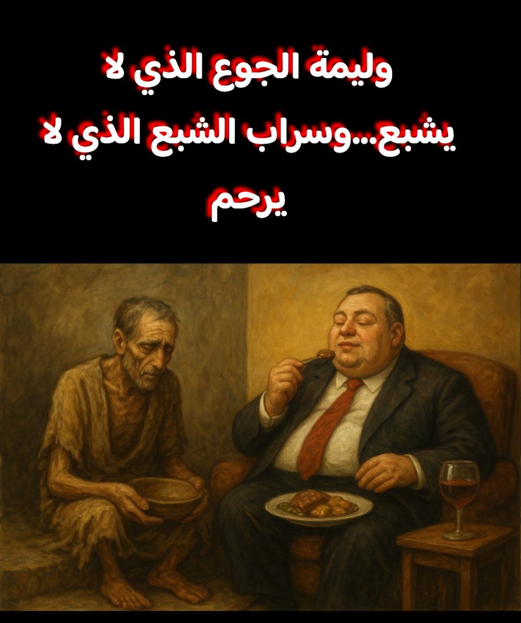 مات زيد كما عاش: بين جوعٍ يطارده وشِبعٍ يطارده… ؛ وكأنّ القدر لم يكن يريد له علاقة سليمة مع الطعام قط ؛ كان يريد أن يبقيه معلقاً بين الشهوة والزهد، بين الحضور والغياب، بين الحياة والموت… ؛ حتى تذوّب روحه أخيراً في وليمة لا جوع فيها ولا شِبع... ؛ ولعلّ آخر ما أحسّه حين أغمض عينيه تلك الليلة، كان طعماً غريباً…؛ طعم يشبه العدالة المؤجلة، أو يشبه — ربما — أول لقمة حقيقية في حياته...!!