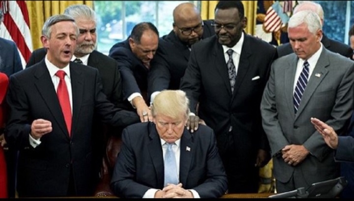وأظهر الفيديو الذي نشره البيت الأبيض على منصات التواصل الاجتماعي الرئيس ترامب وهو جالس خلف مكتبه بينما يلتف حوله نحو 20 قائداً دينياً ، بينهم قساوسة ينتمون للتيار الإنجيلي ، الذين وضعوا أيديهم على كتفيه وأظهروا في لقطات وهم يرفعون دعواتهم من أجل ” حماية وحكمة ” للرئيس وللقوات المسلحة الأميريكية .