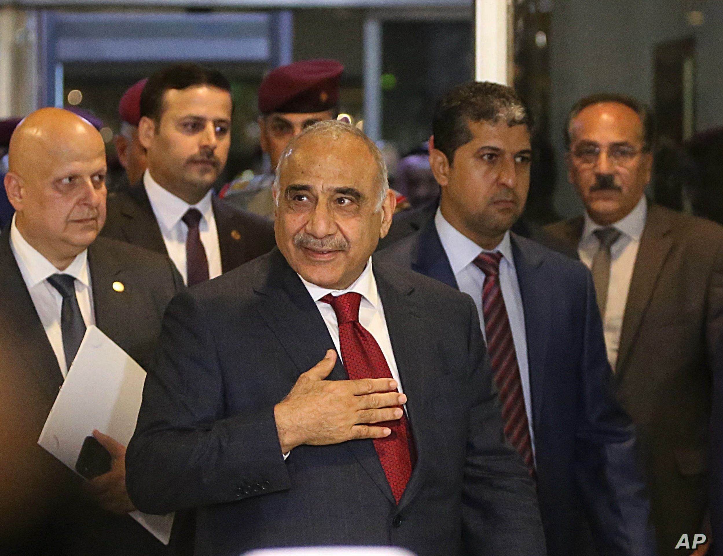 Prime Minister-designate Adel Abdul-Mahdi, center, arrives to the parliament building, in the heavily guarded Green Zone, in Baghdad, Iraq, Wednesday, Oct. 24, 2018. Iraq's parliament is convening to vote on Prime Minister-designate Adel Abdul-Mahdi's ministry appointments, and the parliament must confirm the appointments for the government to be sworn in. (AP Photo/Hadi Mizban)